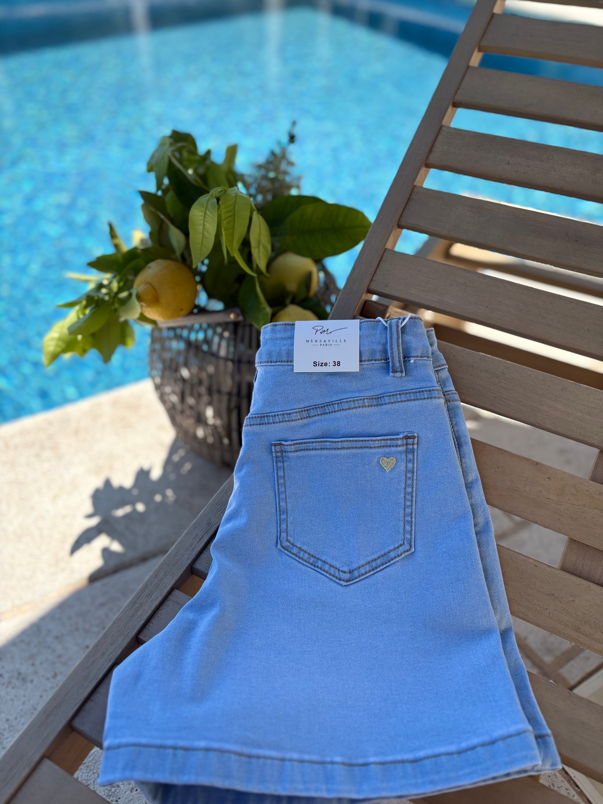 Short Femme en jean clair poches avant et arrière. Petit coeur doré brodé sur l'une des poches arrière.
