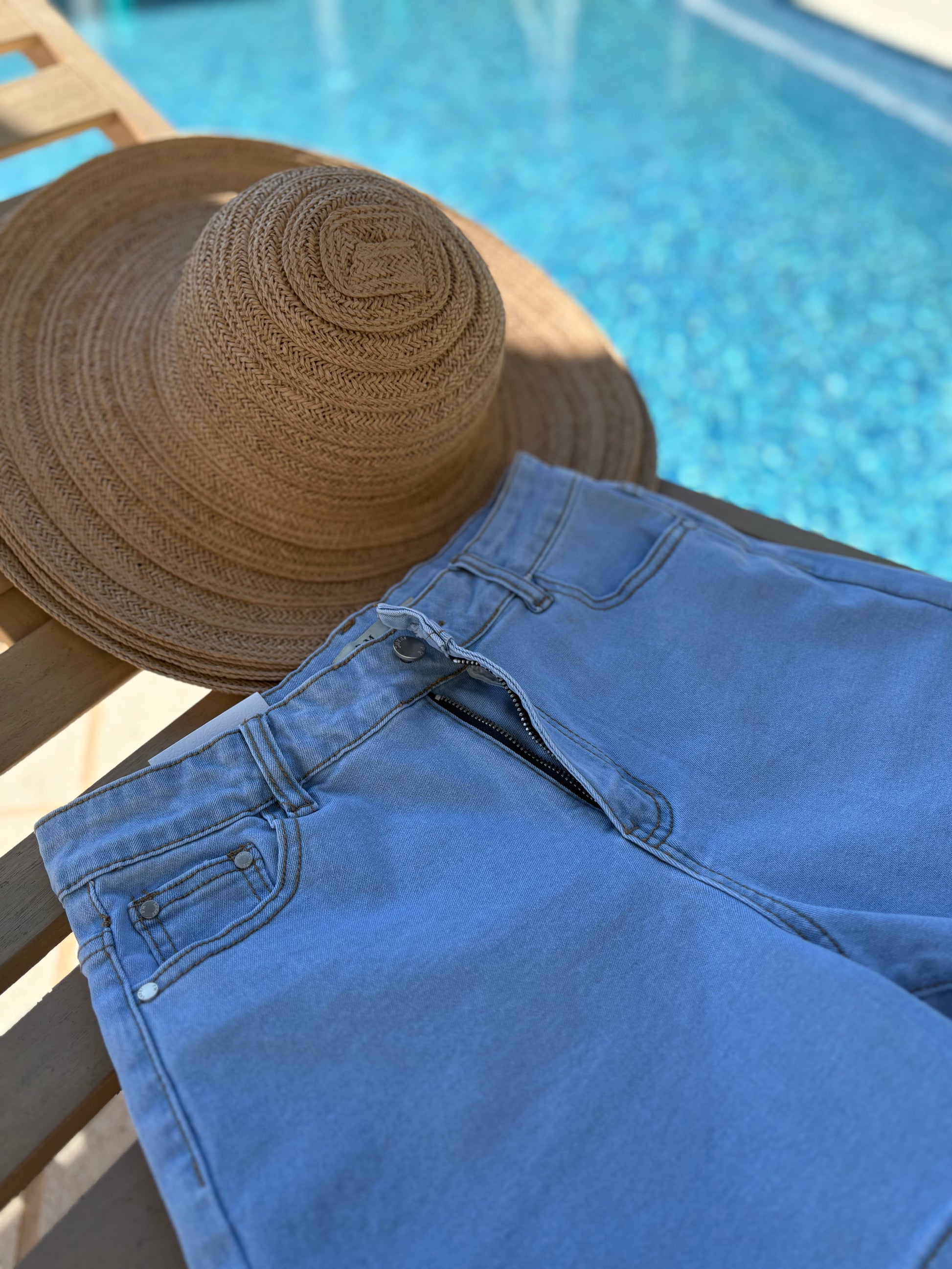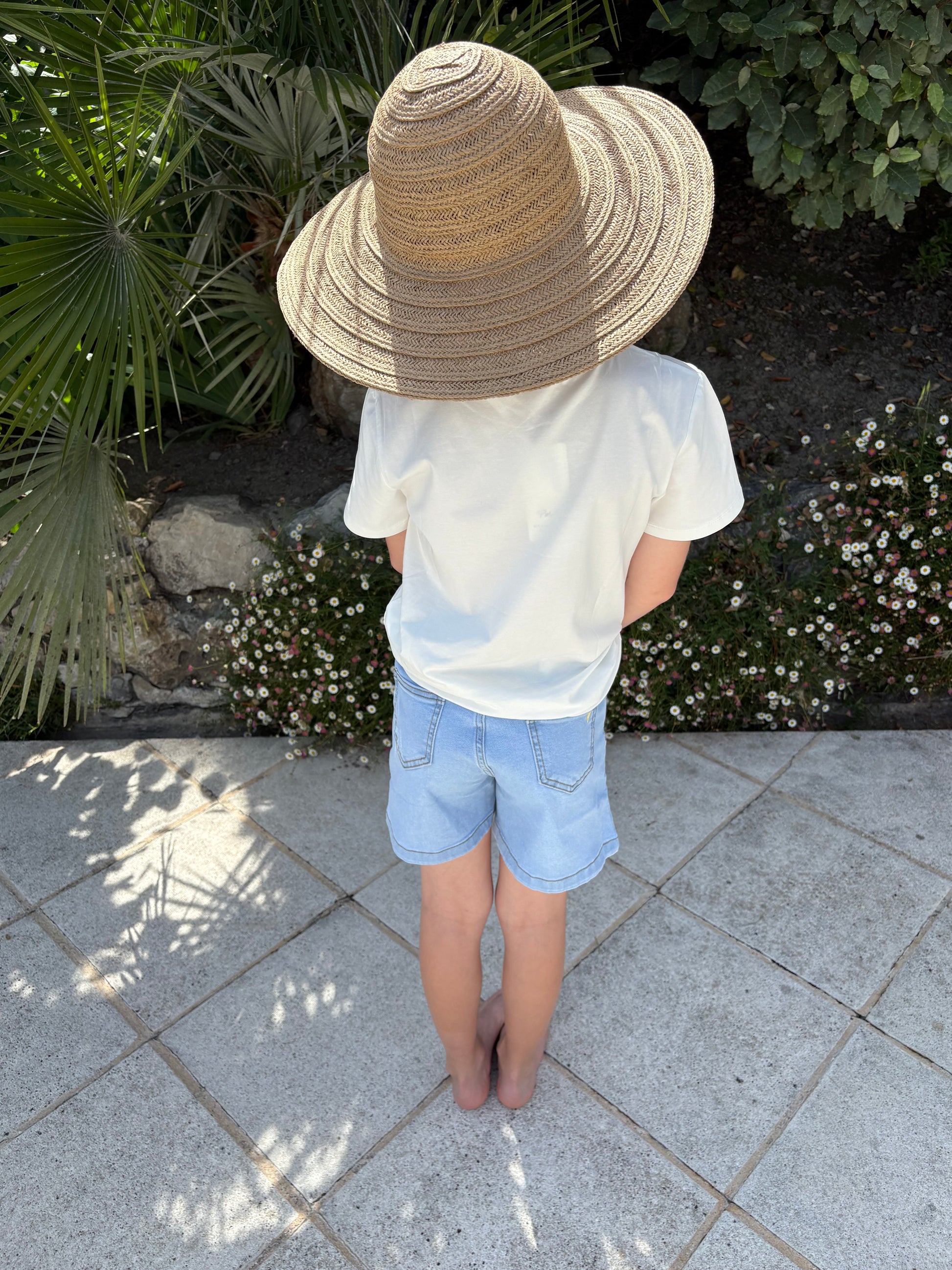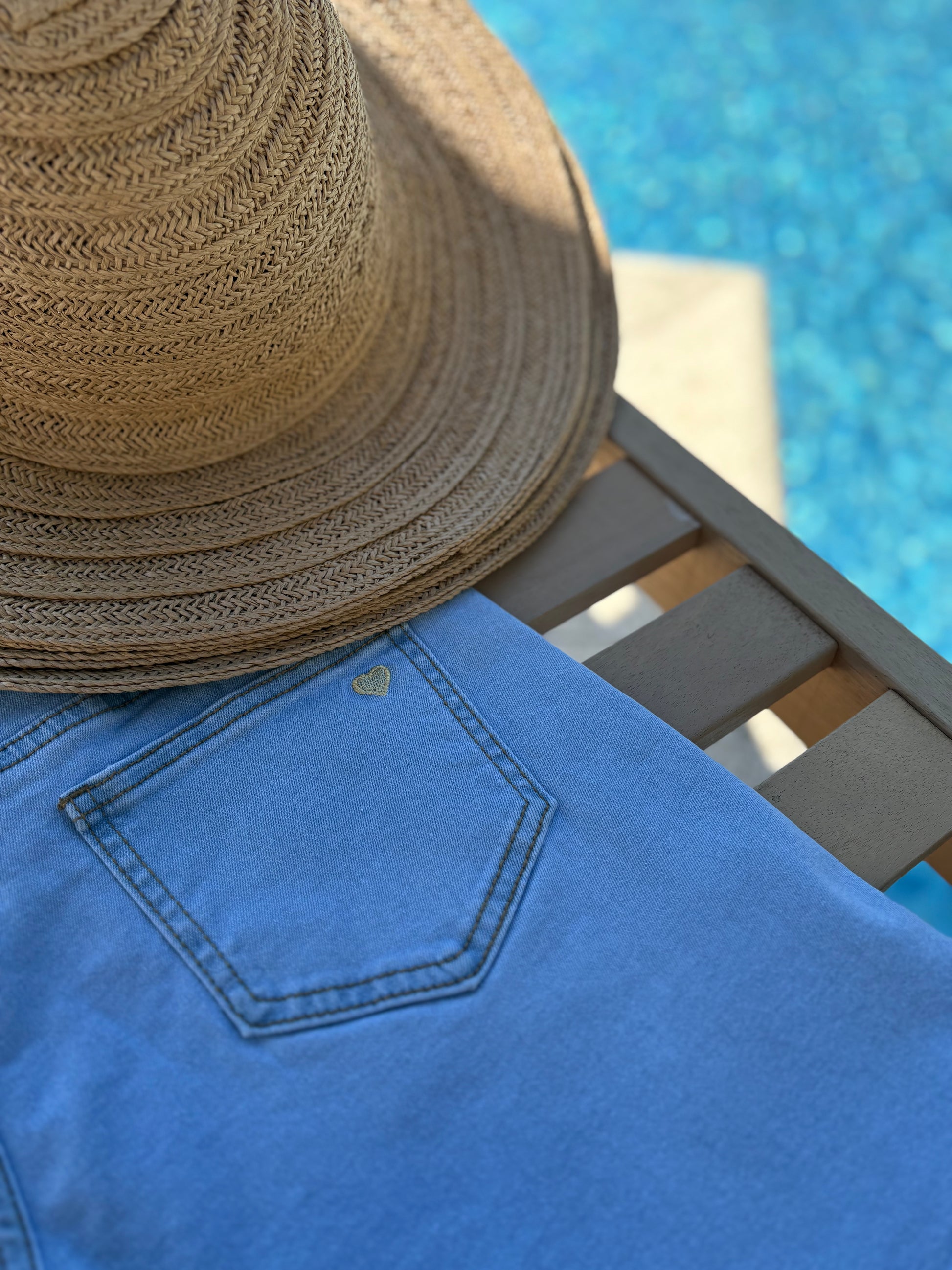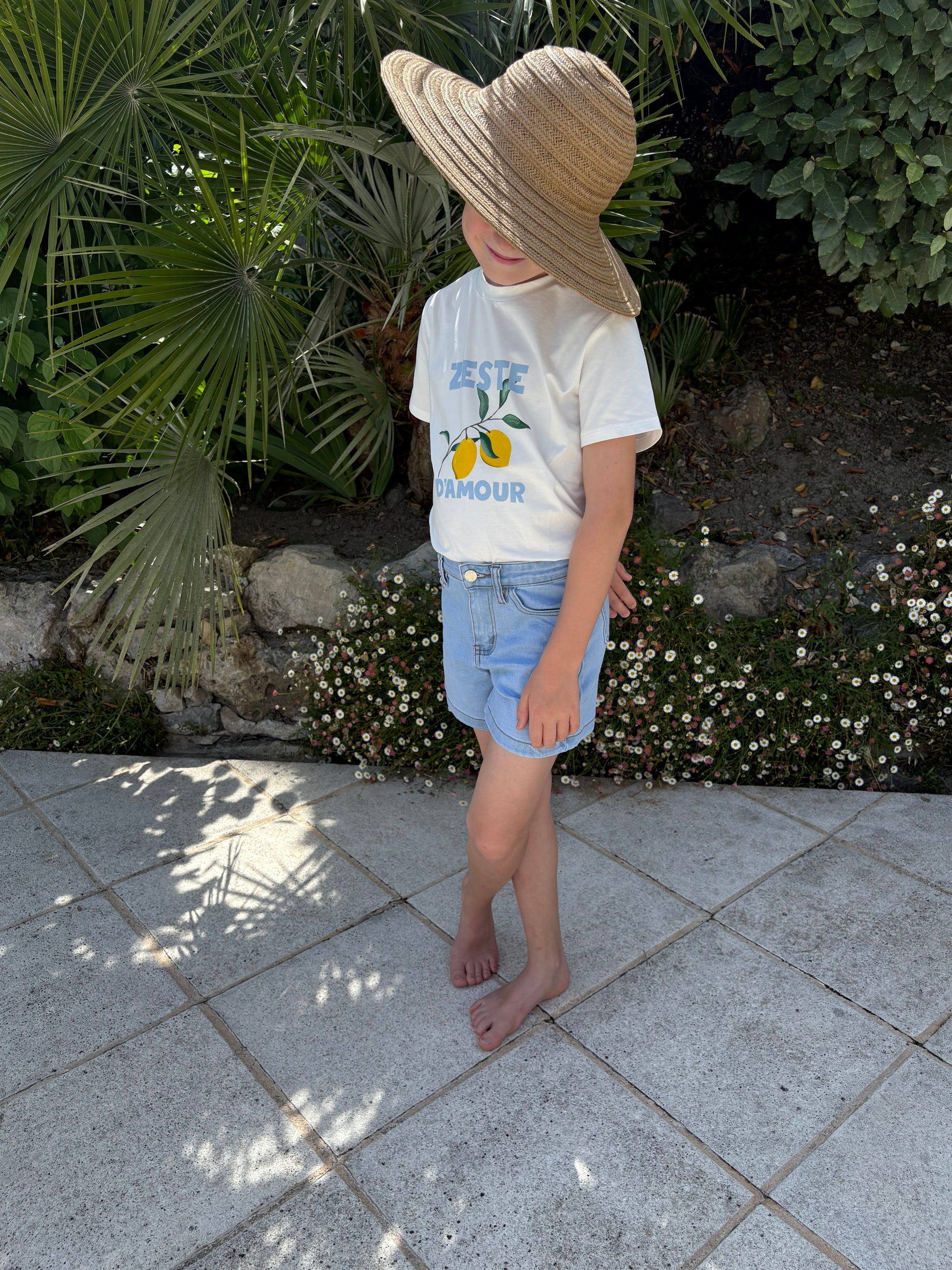 Short Fille en jean clair, poches avant et arrière. Petit coeur doré brodé sur l'une des poches arrière.