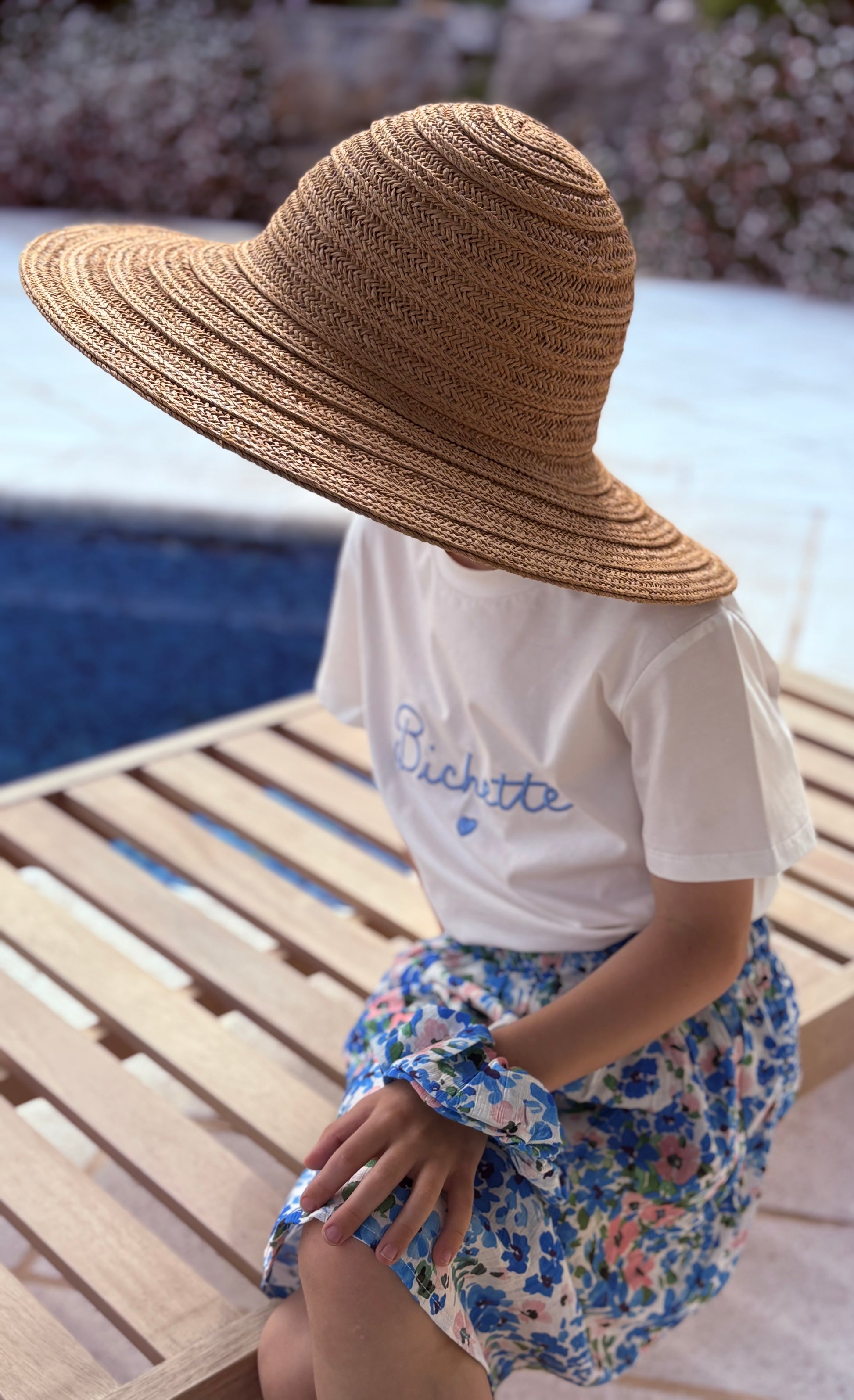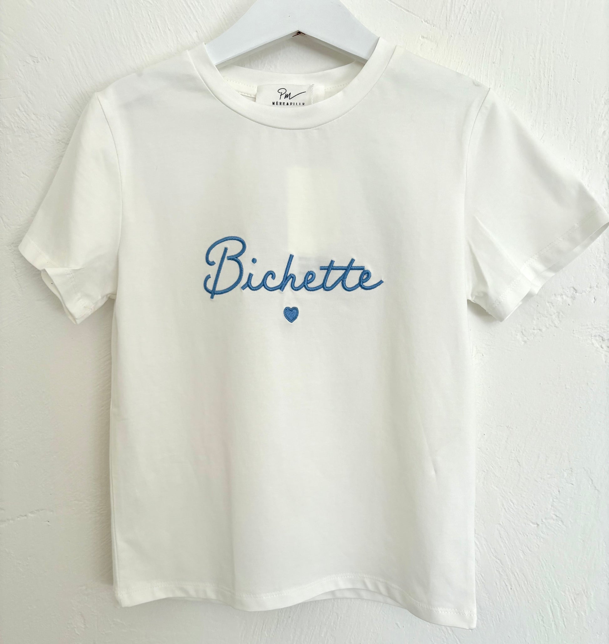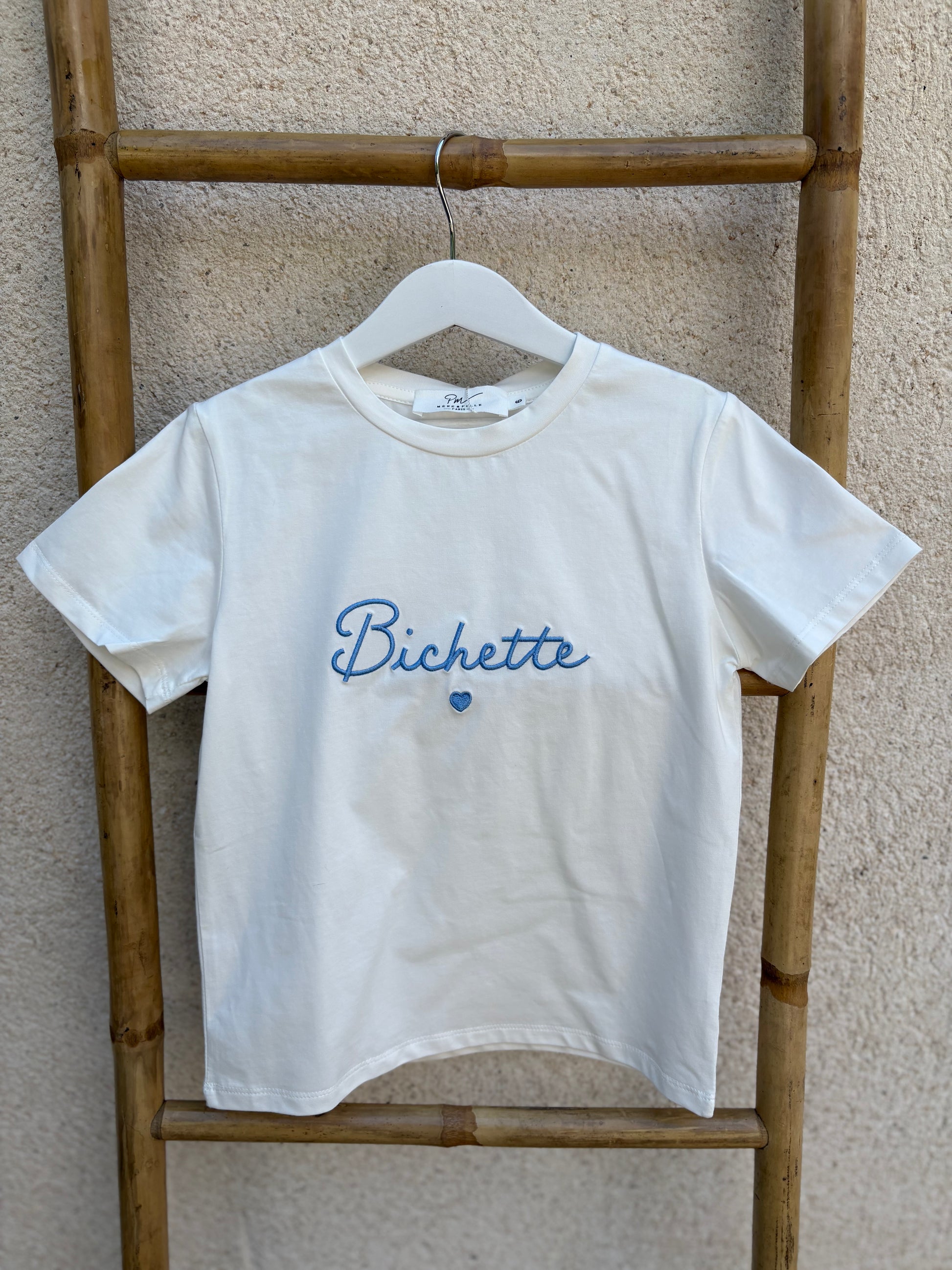 Tee Shirt Fille à col rond, blanc avec broderie bleue ciel "Bichette"