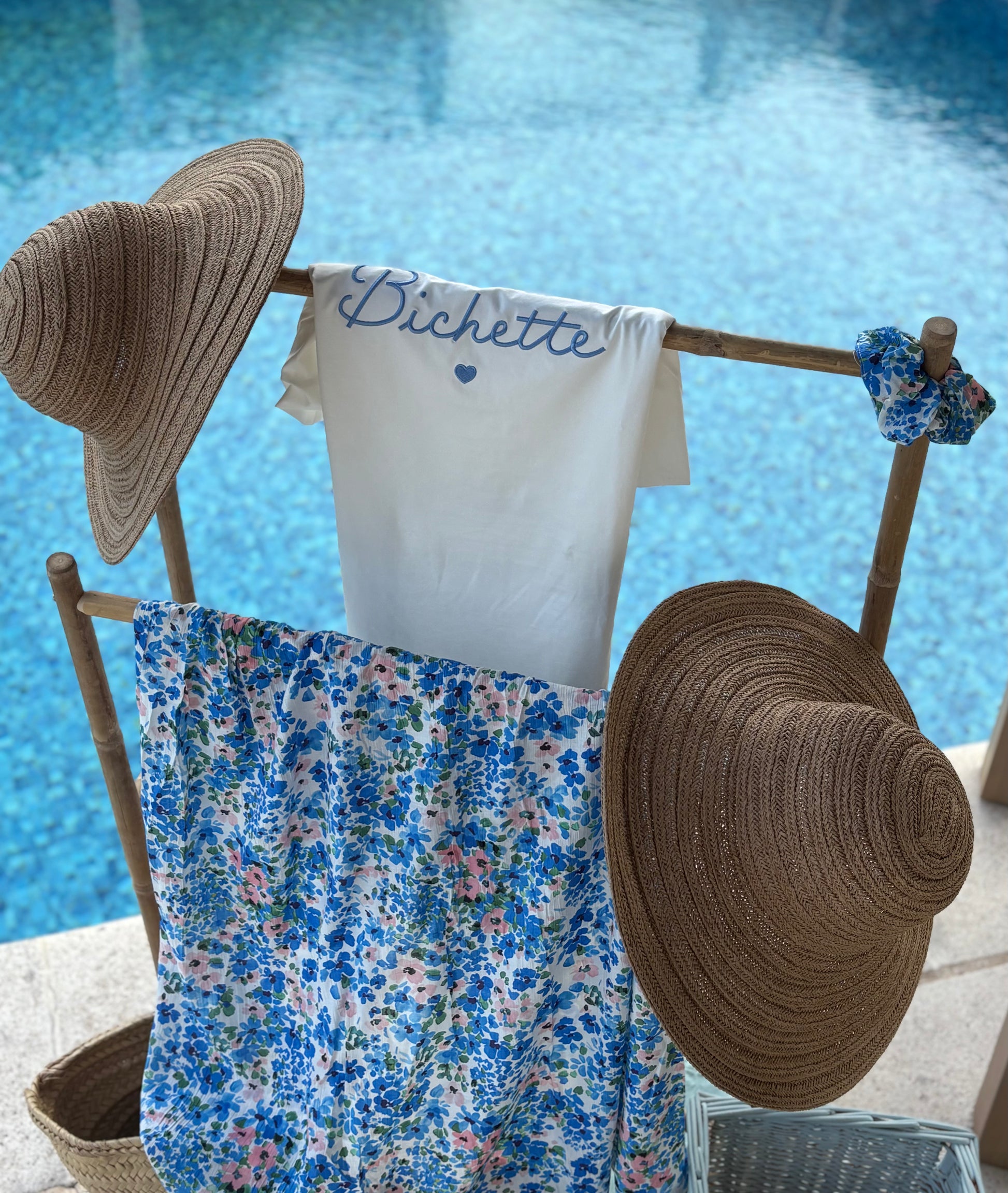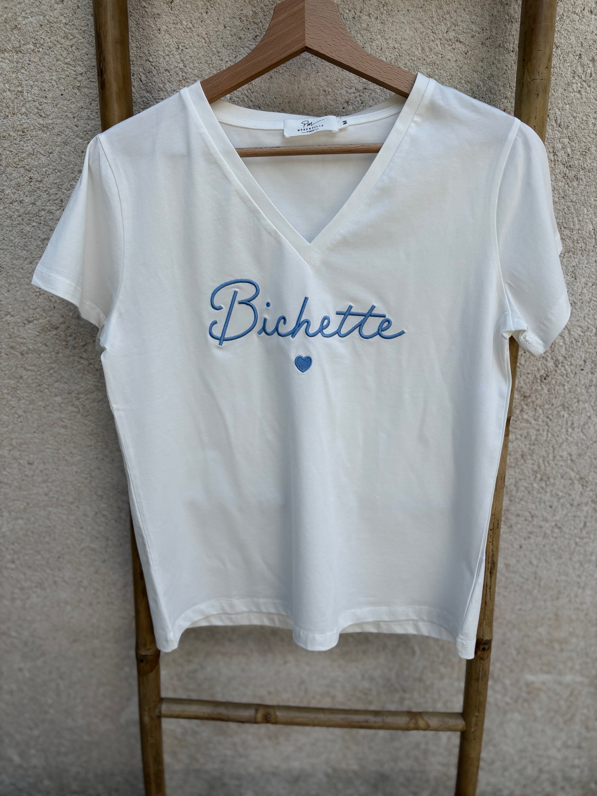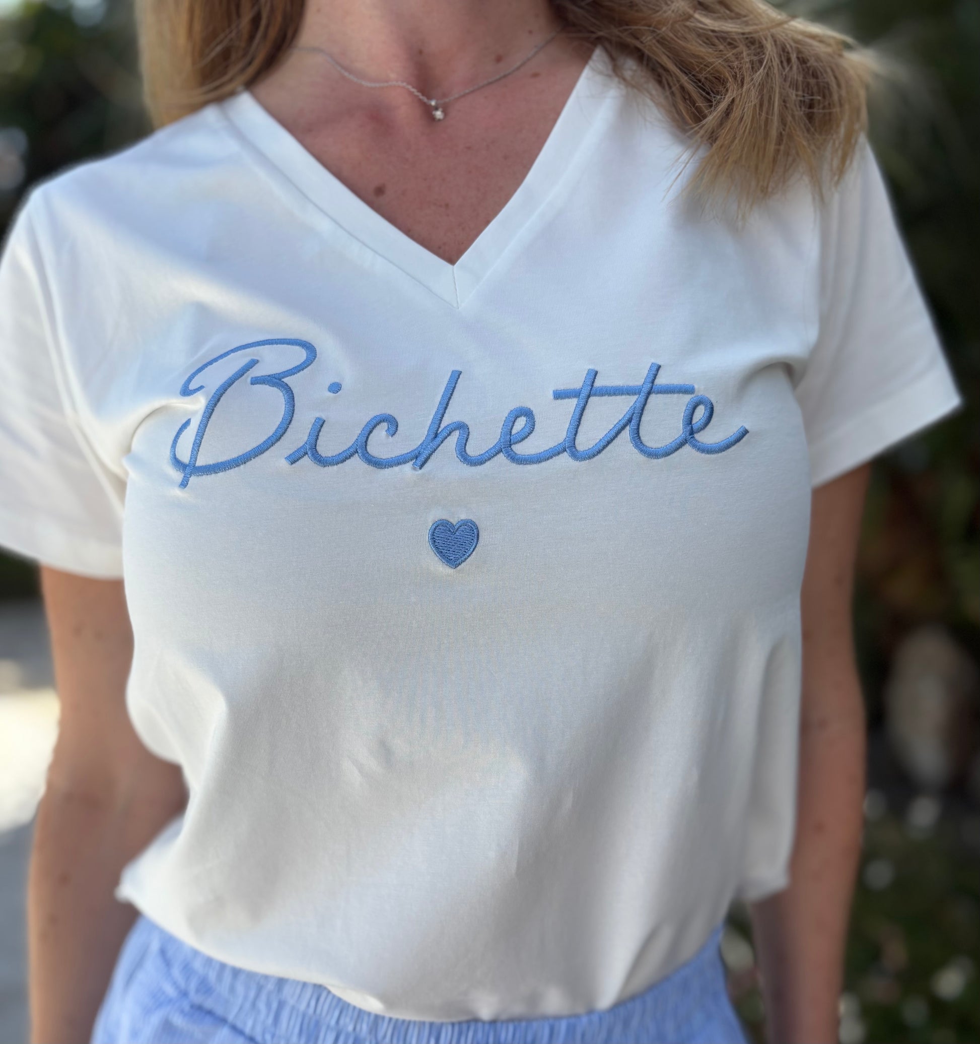 Tee Shirt Femme à col V, blanc avec broderie bleue ciel "Bichette"