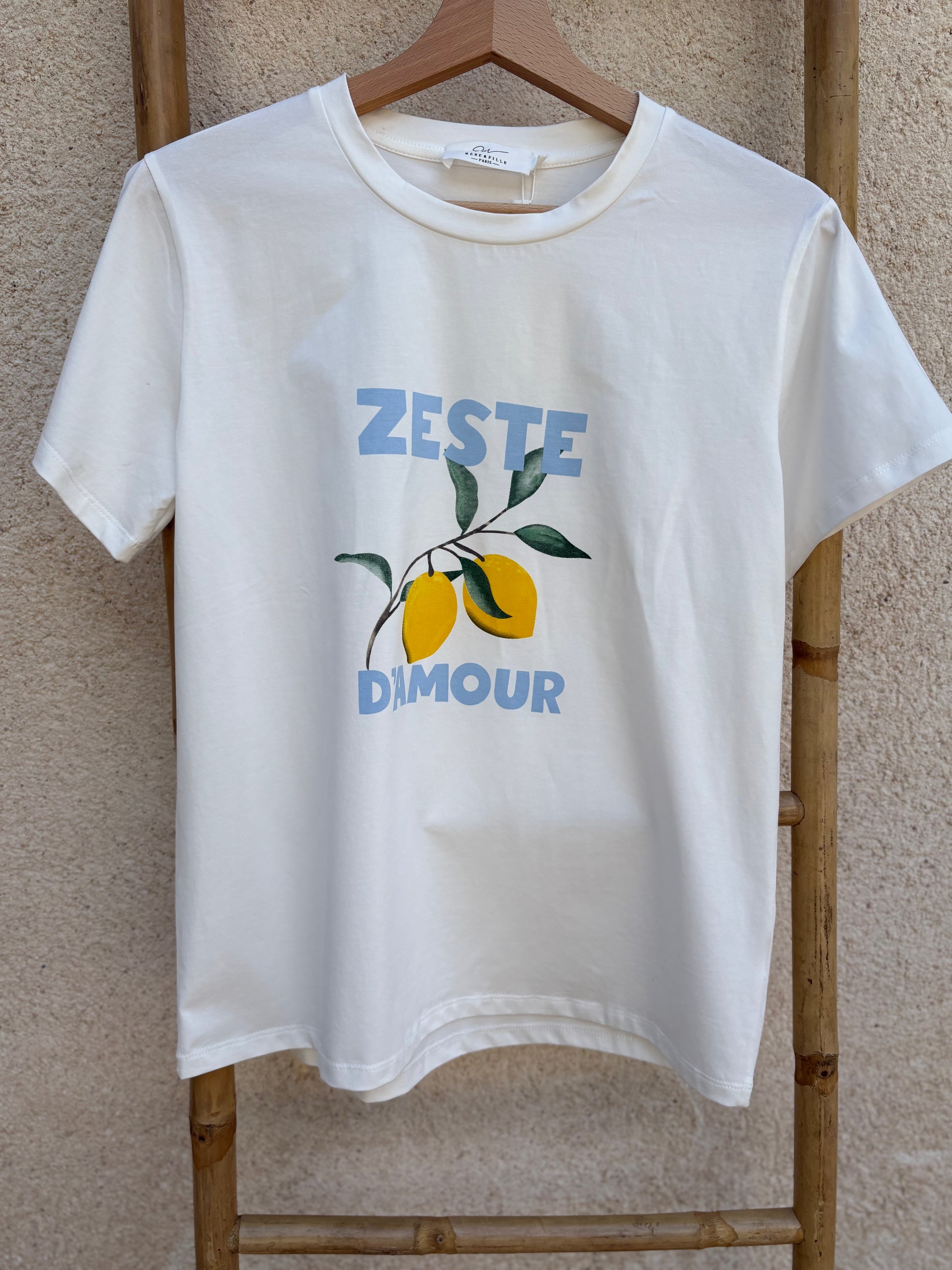 Tee Shirt Femme à col rond, blanc à motif citron avec inscription bleue ciel "ZESTE d'AMOUR"